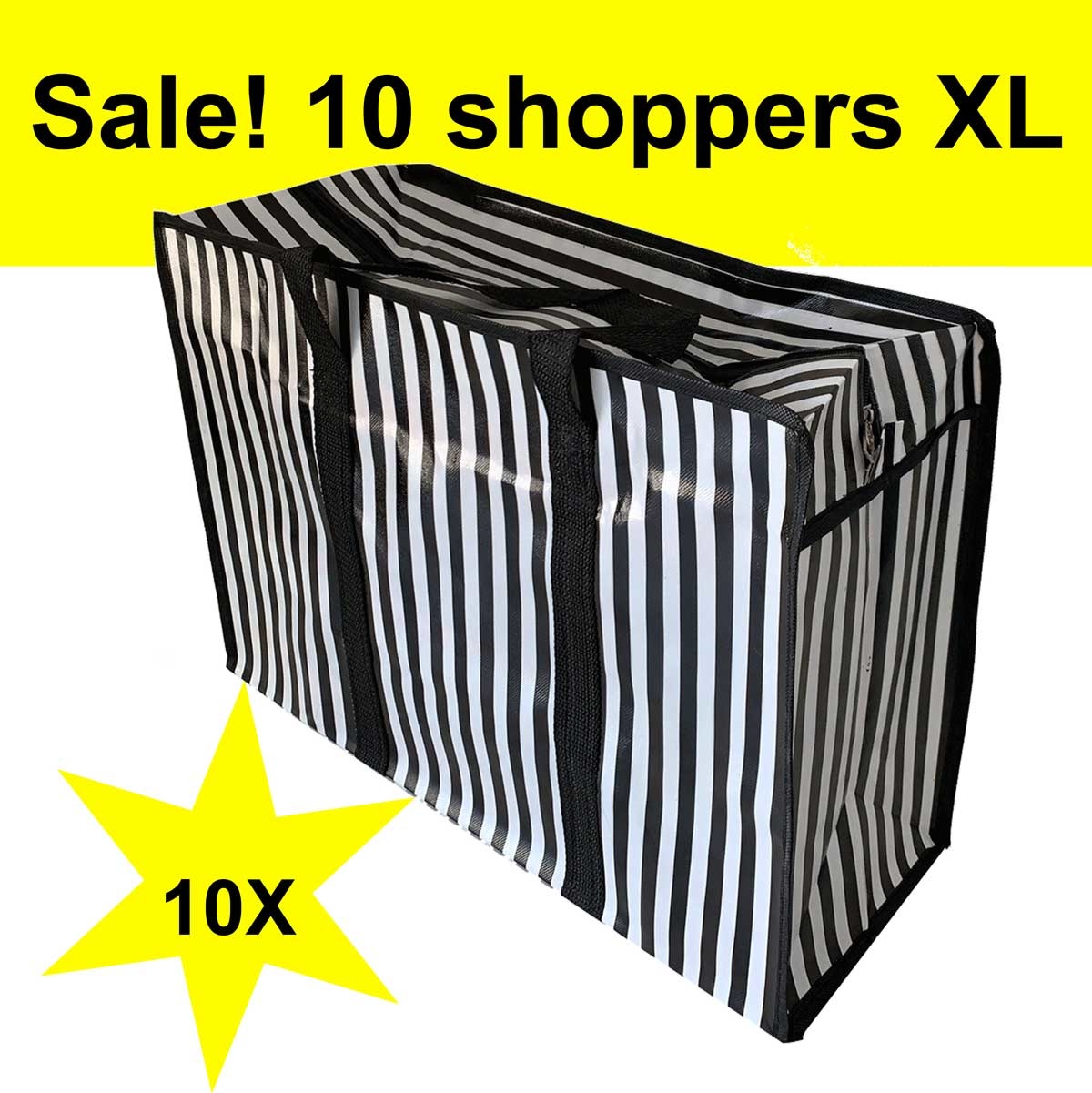 Big Shopper lekker soepel, stevig en met rits! Set van 10 stuks XL shoppers zwart gestreept. De perfecte Wastas / Big shopper / Boodschappentas /Turkse tas met Rits. Set van 10 stuks in de sale