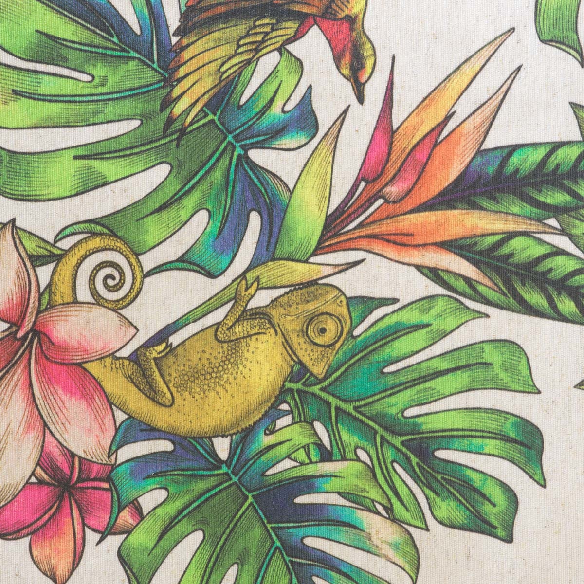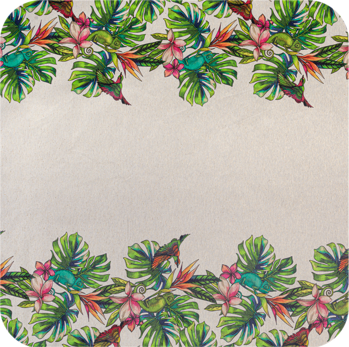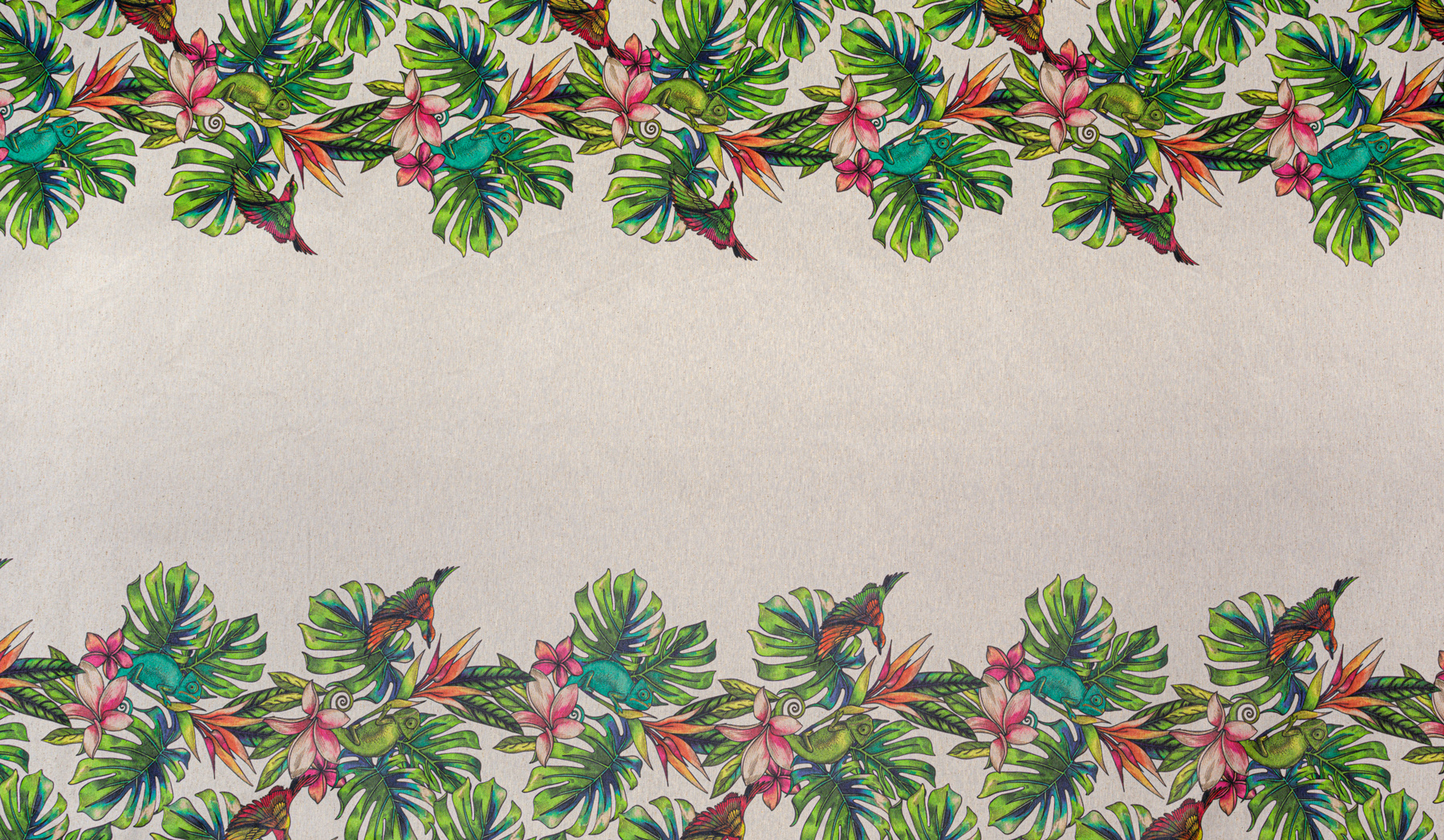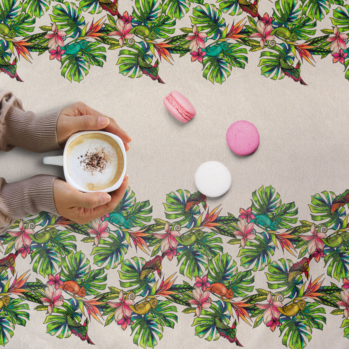 Hip en stijlvol Beige tafelkleed 250 x 140 cm aan de randen stijlvol bedrukt met een vrolijke tropische print. Kant-en-klaar geplastificeerd tafellaken gemaakt van uitstekende kwaliteit tafellinnen. Dit hippe beige tafelkleed, dat perfect aansluit bij de huidige botanische interieur stijl is bedoeld voor een tafel van ongeveer 100 - 110 cm breed zodat het er aan de lange kanten ongeveer 15-20 cm overheen hangt.